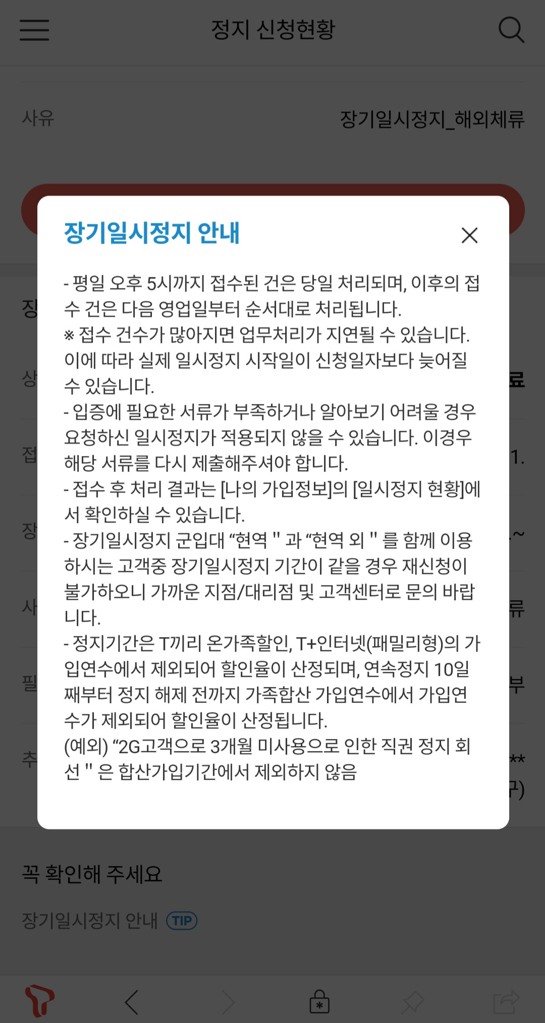 2. T world์–ดํ”Œ๋กœ ๋“ค์–ด๊ฐ€์„œ ์žฅ๊ธฐ ์ •์ง€ ์‹ ์ฒญํ•˜๊ธฐ ๋ˆ„๋ฅธ๋‹ค.